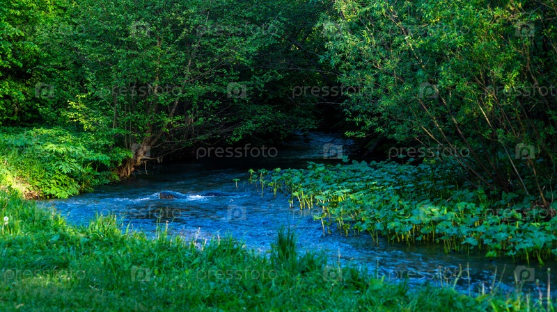 Лесной ручей с зелеными деревьями