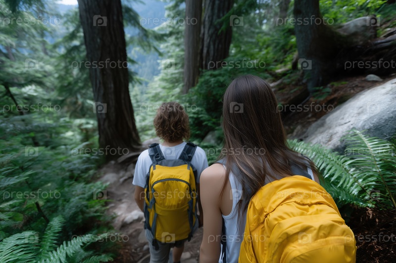 Вид на двух молодых людей с рюкзаками, путешествующих в лесу