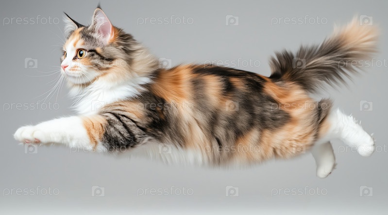 Трехцветная кошка прыгает и смотрит на серый фон