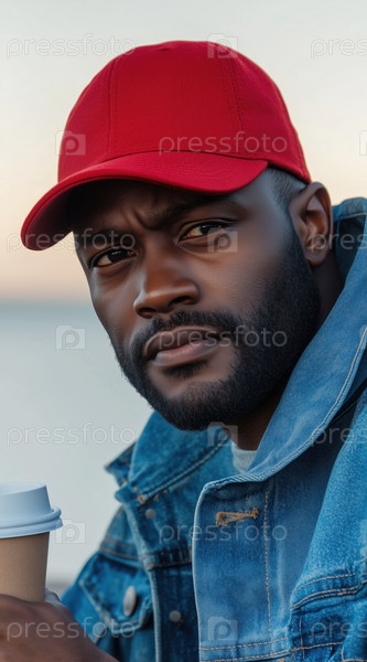 Темнокожий американец в бейсболке и джинсовой куртке держит бумажный стаканчик кофе
