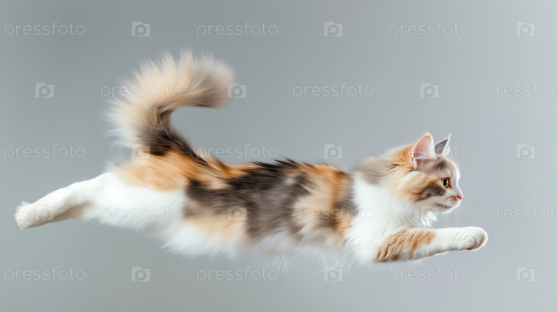 Пушистая трехцветная кошка прыгает на сером фоне