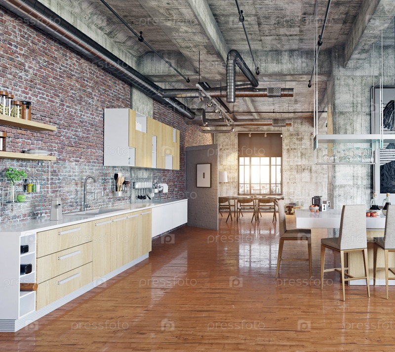Промышленная кухня с теплым освещением