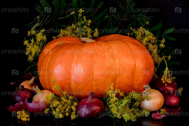 Классический натюрморт с тыквой, репчатым луком и зонтики укропа на темном фоне