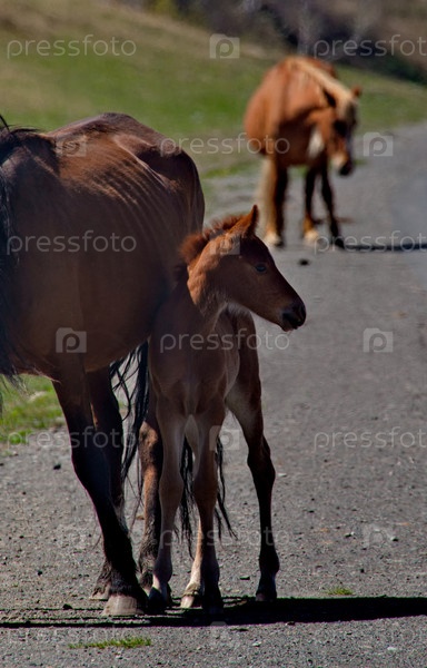 Россия. Юг Западной Сибири. Горный Алтай. Маленький жеребенок прижимается к своей маме на обочине Чуйского тракта