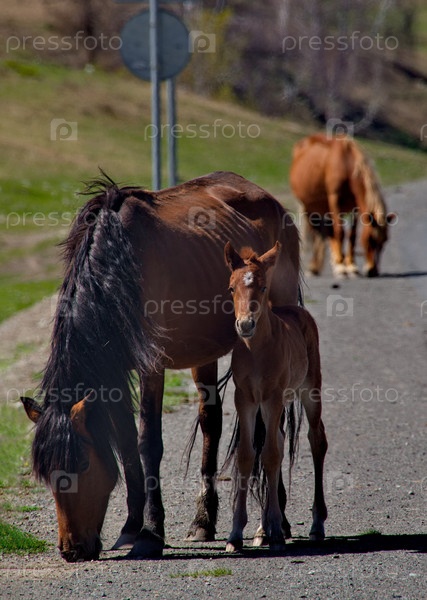 Россия. Юг Западной Сибири. Горный Алтай. Маленький жеребенок прижимается к своей маме на обочине Чуйского тракта