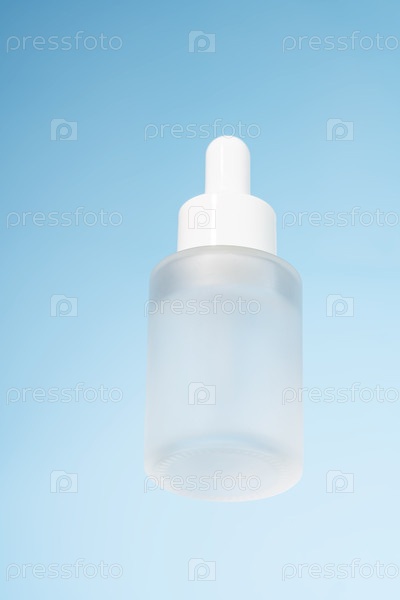 Белая небрендовая бутылка капельницы на стекле на синем фоне. Презентация продукции по уходу за кожей. Модная витрина. вид сверху