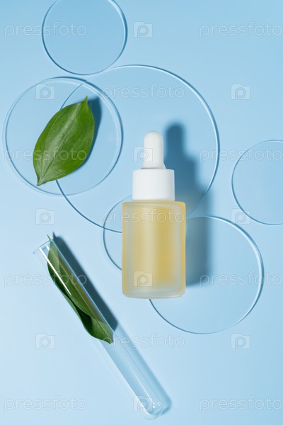 Органический косметический продукт, Сыворотка лица с натуральным ингредиентом и лабораторная посуда на синем фоне, вид сверху