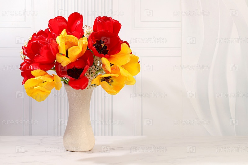 Натюрморт с красивыми весенними цветущими тюльпанами в вазе на элегантном фоне. Абстрактная цветочная аранжировка и баннер для экрана, цветочная открытка с концепцией летнего приветствия
