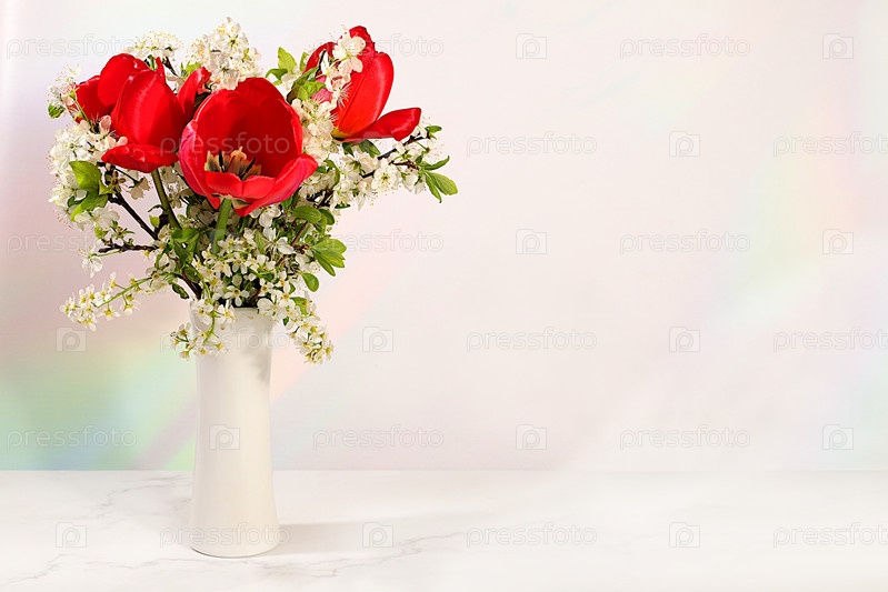 Натюрморт с красивыми весенними ветвями цветущей птичьей вишни и красными тюльпанами в вазе на элегантном фоне. Абстрактная цветочная композиция и баннер для экрана, цветочная открытка