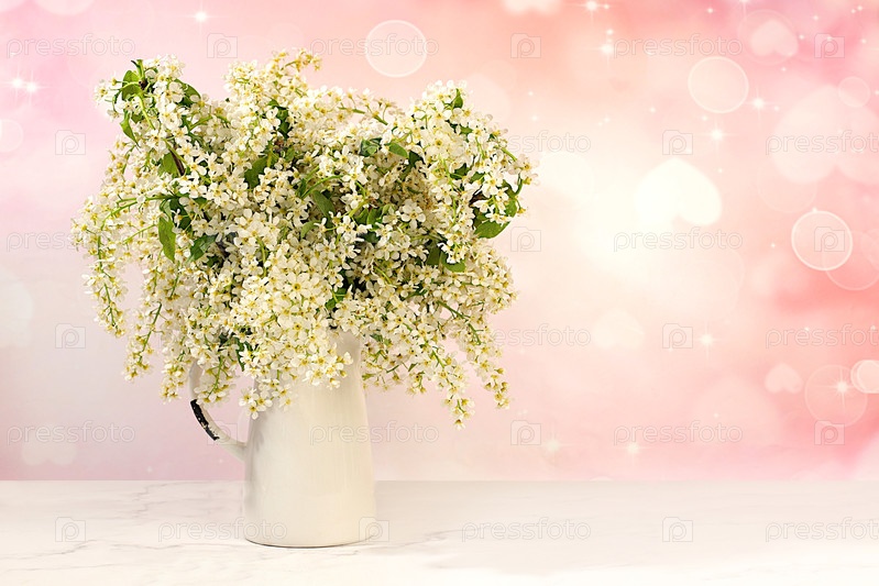 Абстрактная цветочная композиция и баннер для экрана, Натюрморт с красивыми весенними ветвями цветущей птичьей вишни в вазе на элегантном фоне. Цветочная открытка с концепцией летнего приветствия