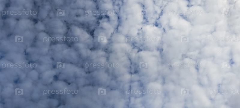 Небо плотно покрыто небольшими белыми кучевыми облаками. Одна сторона неба с облаками темная, другая освещена солнцем