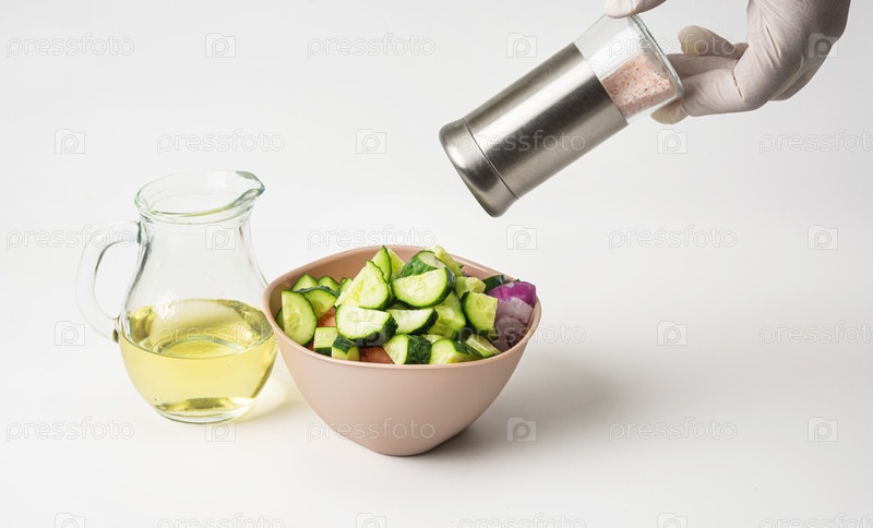 Готовится овощной салат в миске на белом фоне. Рядом оливковое масло в стеклянном кувшине. Женская рука добавляет соль в салат