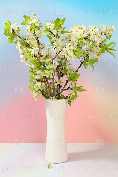 Натюрморт с красивыми весенними вишневыми ветвями в вазе на элегантном фоне. Абстрактная цветочная аранжировка и баннер для экрана, Флоральная открытка с концепцией летнего приветствия