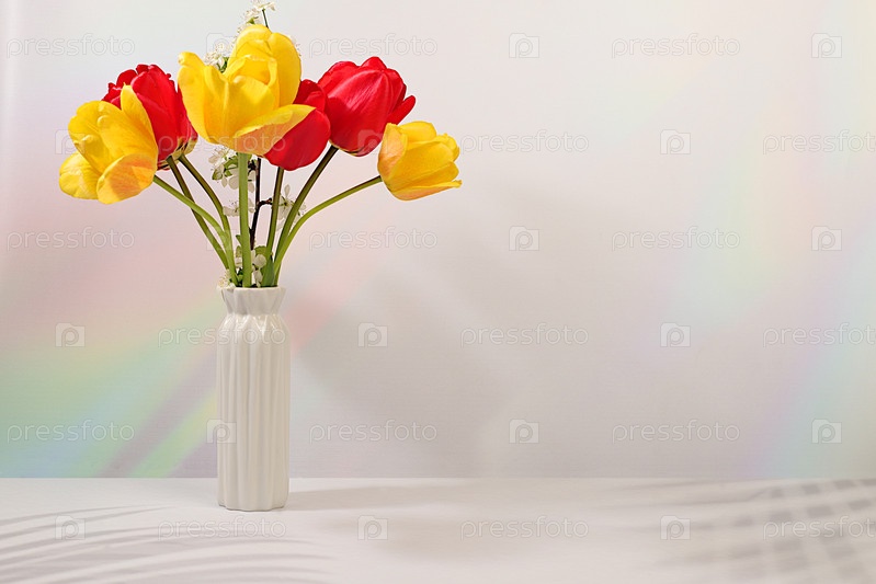 Красивые весенние цветущие тюльпаны и вишневые ветви в вазе на элегантном фоне. Абстрактная цветочная аранжировка и баннер для экрана, Натюрморт, Флоральная открытка с концепцией летнего приветствия