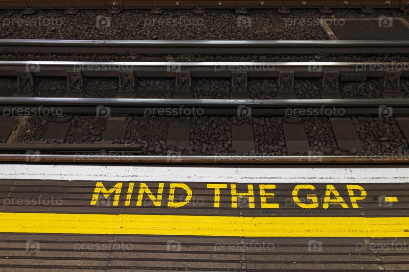 Иконический текст предупреждения на платформе станции метро, напоминающий пассажирам о разрыве поезда