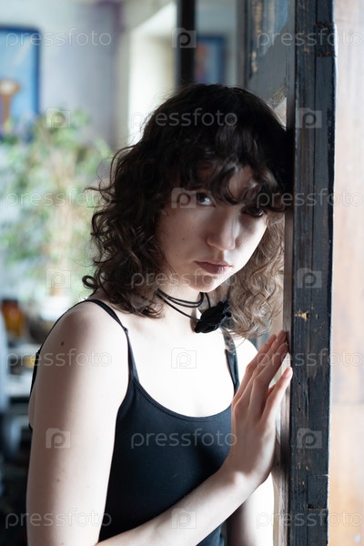 Портрет молодой красивой женщины с вьющимися волосами в студии