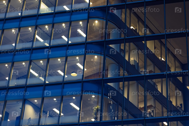 Освещенные окна современного стеклянного офисного здания ночью демонстрируют городскую деловую активность