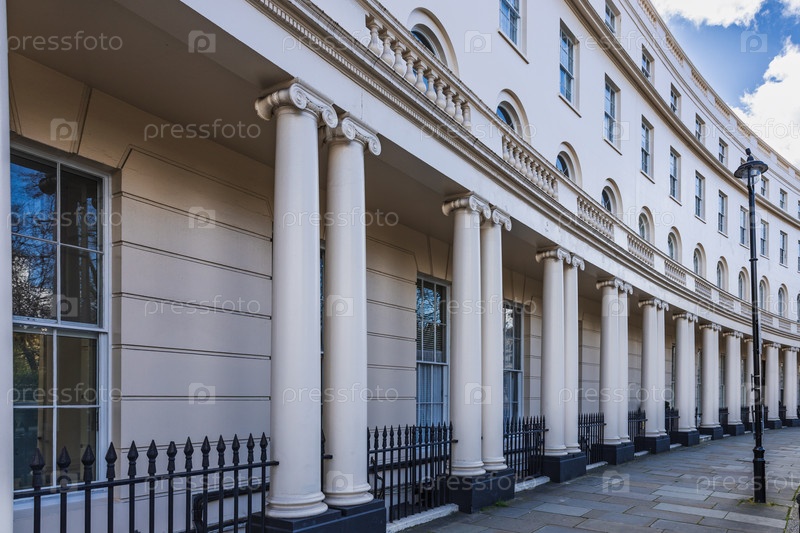 Очаровательная изогнутая терраса белых грузинских домов демонстрирует классическую архитектуру в историческом районе Лондона