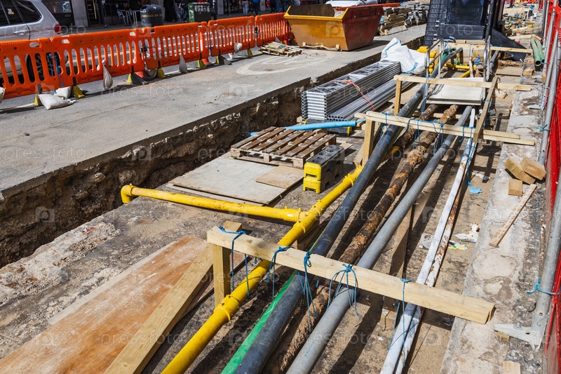 Подробный вид строительной траншеи с трубами и кабелями, предназначенными для коммунальных услуг