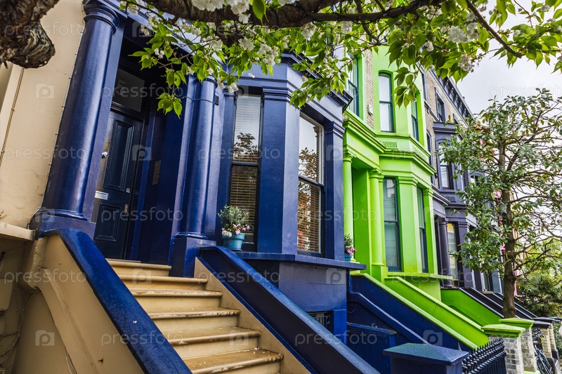 Ярко окрашенные рядные дома в Ноттинг-Хилле с знаковыми красочными фасадами на живописной лондонской улице