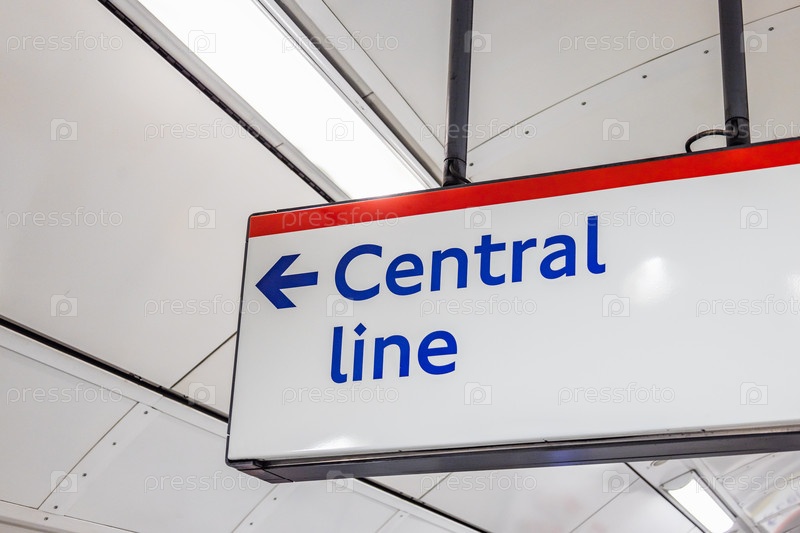 Четкий и простой указатель центральной линии, висящий на потолке станции метро в Лондоне