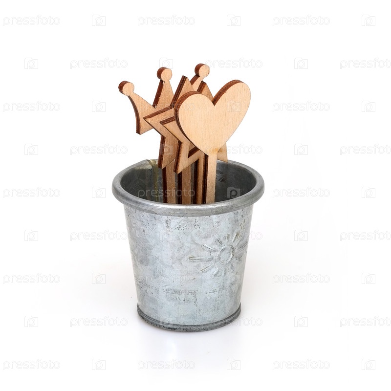 Декоративные деревянные элементы (звезды, сердца, короны), выделенные на белом фоне для создания праздничных плакатов, баннеров и открыток