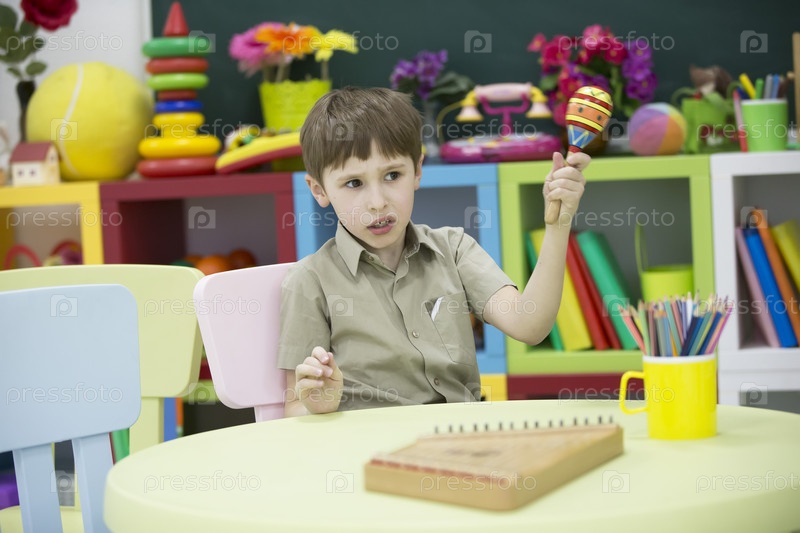 Ребенок с музыкальным инструментом. Мальчик учится играть в дульцимер