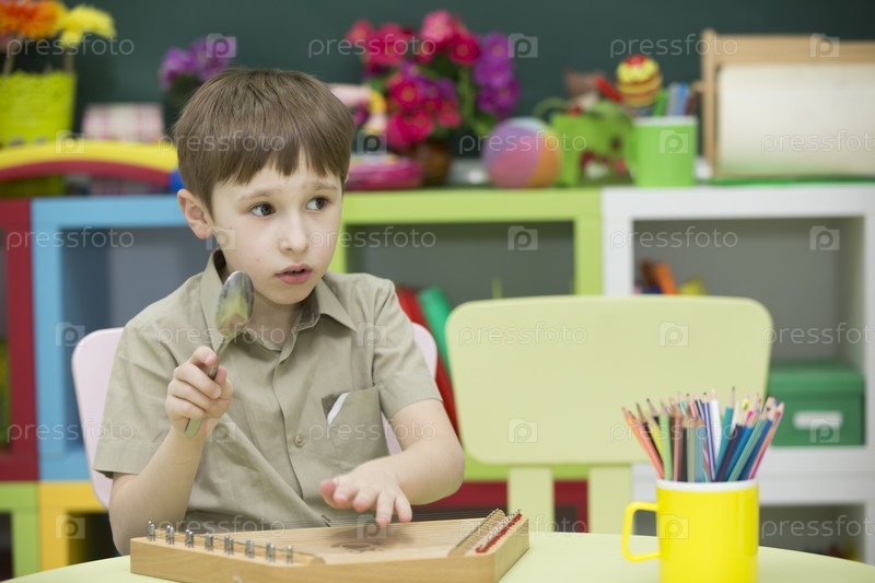 Ребенок с музыкальным инструментом. Мальчик учится играть в дульцимер