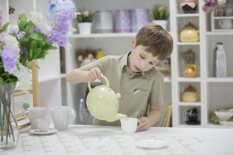 Ребенок на кухне наливает чай