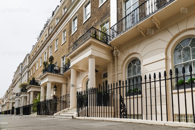 Историческая жилая улица Лондона, демонстрирующая классическую архитектуру и арочные окна