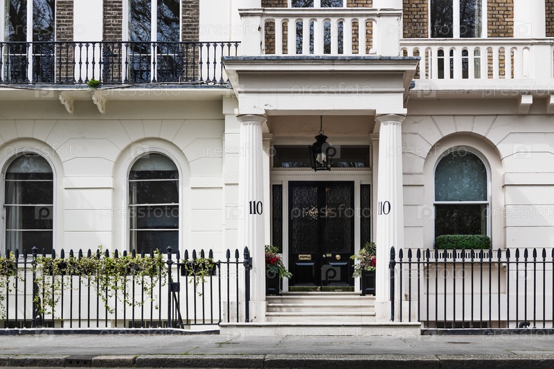 Лондонский таунхаус в классическом грузинском стиле с черной дверью и белым фасадом