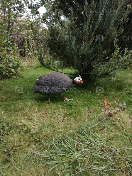 Обыкновенная цесарка активно кормится возле кустарников