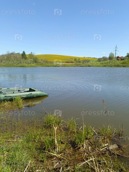 Спокойная сцена озера с зеленой надувной лодкой и желтыми цветами
