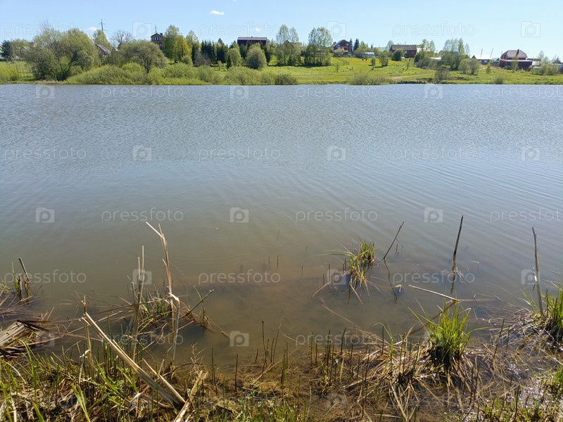 Озеро Tranquil Village с спокойными отражающимися водами и зарождающейся растительностью, демонстрирующая живописные сельские дома, расположенные среди пышных деревьев под ясным ярким небом