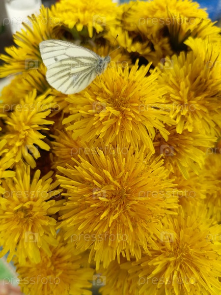 Зеленая белая бабочка, мягко отдыхающая на ярких желтых одуванчиках, символизирующая весеннюю красоту, против мягко размытого одуванчика