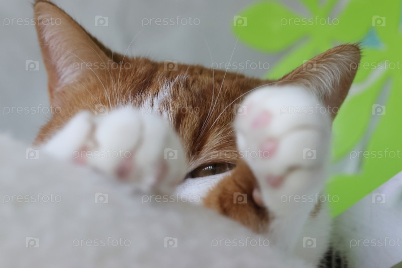 Голова имбирной кошки и лапы. Глаз в фокусе
