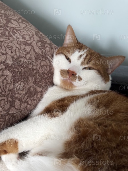 Имбирная кошка спит на диване. Близко