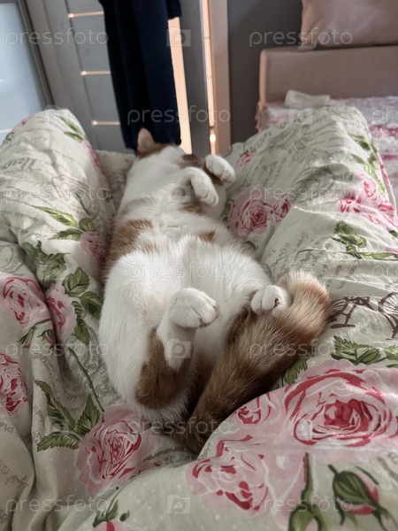 Имбирная кошка спит на спине, вытянутая на одеяле между ног хозяина