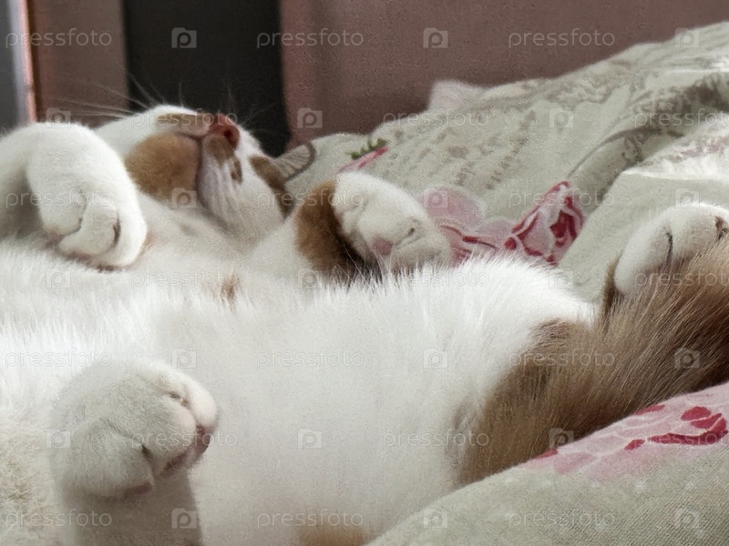 Имбирная кошка спит на спине, вытянутая на одеяле между ног хозяев. Близко