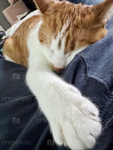 Имбирная кошка спит на хозяине, с вытянутой вперед лапой. Близко