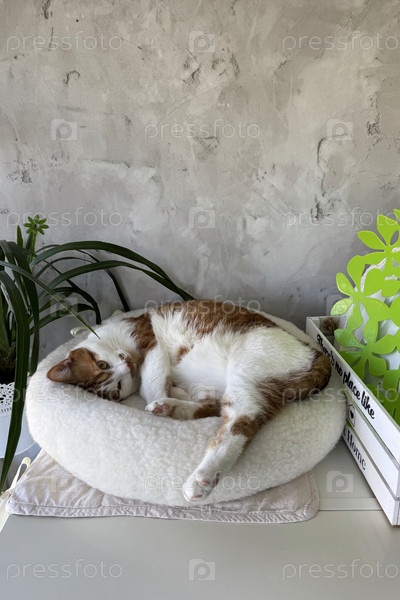 Имбирная кошка спит в кровати на холодильнике. Наклонный угол