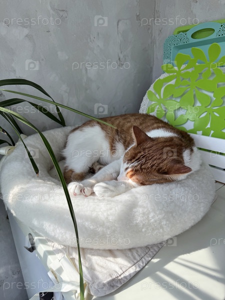 Имбирная кошка спит в кровати на холодильнике