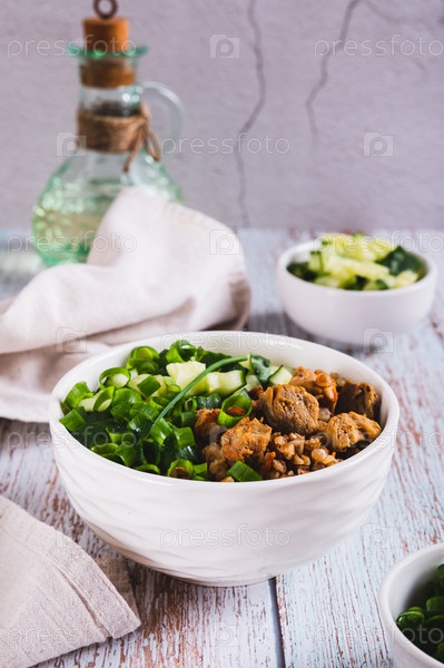 Гречневая каша с мясом, огурцом и стручками в миске на столе вертикальный вид