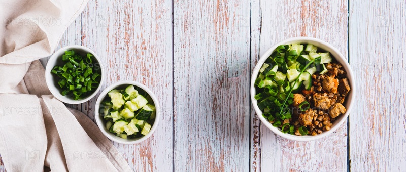 Чаша гречки, мяса, огурца и зеленого лука на веб-баннере с видом на столешницу