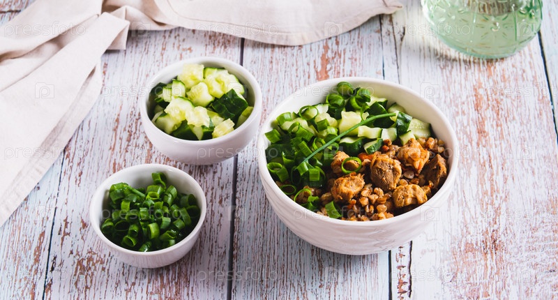 Гречневая каша с мясом, огурцом и стручками в миске на столе веб-баннер