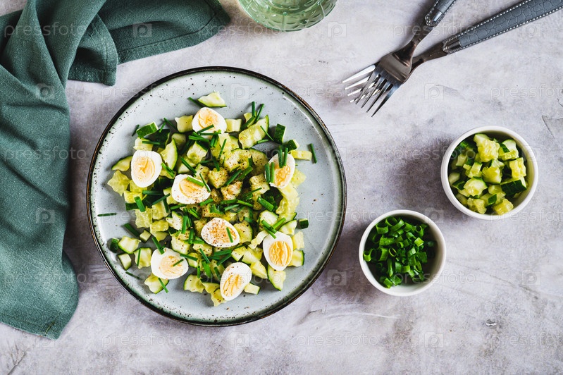 Свежий салат из огурцов, перепелиных яиц и зеленого лука на тарелке на столе сверху