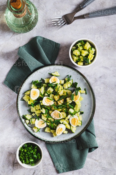 Аппетитная смесь огурцов, яиц и стручков на тарелке на столе и вертикальный вид