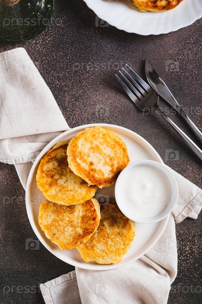 Аппетитные картофелины и сметана на тарелке на столе и вертикальный вид