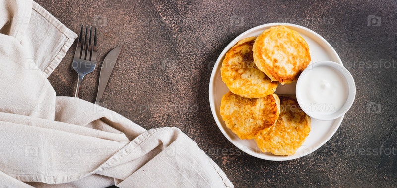 Аппетитные картофелины и сметана на тарелке на веб-баннере с видом на столешницу