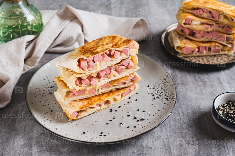 Хрустящие конверты с колбасой и сыром в плоском хлебе на тарелке на столе